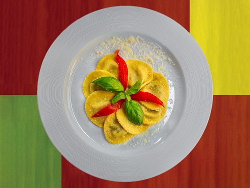 Tag: piatto, verde, rosso, bianco, basilico, giallo, cerchio, formaggio, colori, foglie, ravioli, cibo, pasta, tovaglia, peperone, ceramica.
