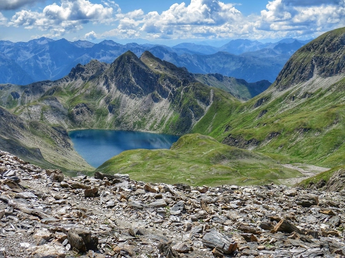 Tag: nuvole, cielo, lago, montagne, verde, azzurro, panorama, sassi, erba, paesaggio, montagna, prato, vette, pietre, bianco, acqua, roccia, laghetto.