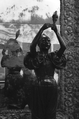 La Filatrice, scultura dell'artista Italiano di Origine Sarda Francesco Ciusa, riflessa da uno specchio antico che crea particolari giochi di ombre e luci.
