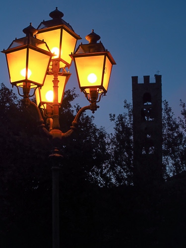 Tag: torre, lampione, luci, alberi, lampioni, notte, sera, giallo, controluce, notturno.