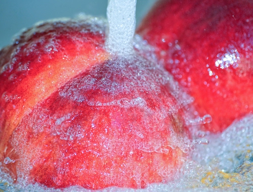 Tag: acqua, rosso, frutta, bolle, getto, gocce, macro, lavare, pesca, schiuma.