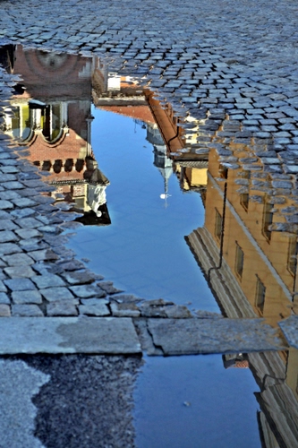 Riflessa in una pozzanghera la chiesa di Santa Maria