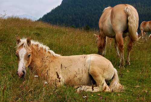 Tag: cavalli, erba, coda, criniera, prato, animali, verde, montagna, pascolo, marrone, muso, alberi, fiori, orecchie, sdraiato, zampe.