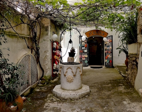 Tag: pozzo, negozio, piante, cortile, verde, bianco, porta, pergolato, borse, palloncini, secchio, rampicanti, carrucola, foglie, vasi, catena.