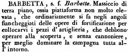 Barbetta - s. f. Barbette. Massiccio di terra piano, ossia piattaforma non molto elevata, che ordinariamente si fa negli angoli fiancheggiati delle opere di fortificazione per collocarvi i pezzi d'artiglieria, che debbono operare alla scoperta, e senza cannoniere, per meglio dominare la campagna tutta all'intorno. [immagine]