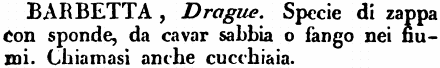 Barbetta - Drague. Specie di zappa con sponde, da cavar sabbia o fango nei fiumi. Chiamasi anche cucchiaia. [immagine]