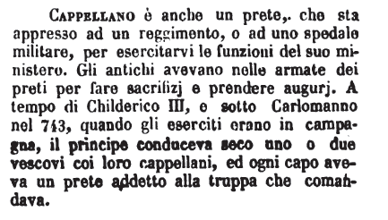 | Cappellano - [T.] S. m. In orig. il Ministro ecclesiastico che custodiva la cappa di S. Martino in pace, e la portava, come insegna protettrice, alla guerra. [G.M.] Magri, Notiz. Voc. Eccl. alla voc. Cappellano.