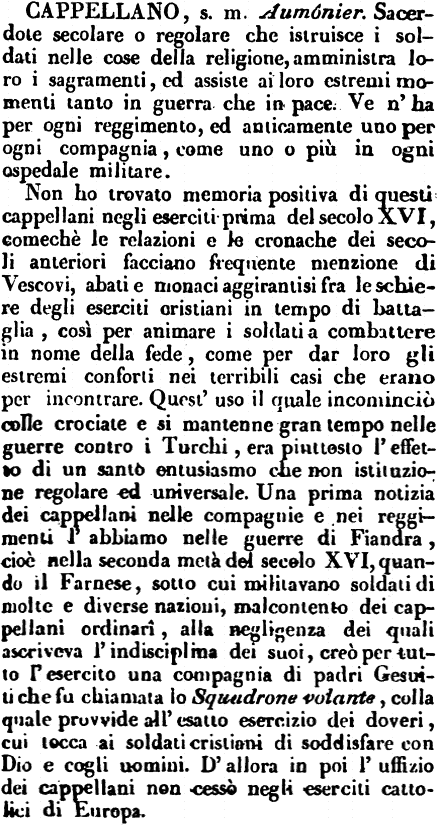 | Cappellano - s. m. Aumónier. Sacerdote secolare o regolare che istruisce i soldati nelle cose della religione, amministra loro i sagramenti, ed assiste ai loro estremi momenti tanto in guerra che in pace. Ve n'ha per ogni reggimento, ed anticamente uno per ogni compagnia, come uno o più in ogni ospedale militare.