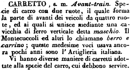 | Carretto - s. m. Avant-train. Specie di carro con due ruote, il quale forma la parte di avanti dei veicoli da quattro ruote, ed ai quali si unisce mediante una cavicchia di ferro verticale detta maschio. Il Montecuccoli ed altri lo chiamano berro e carrino; queste medesime voci usava ancora pochi anni sono l'Artiglieria italiana.