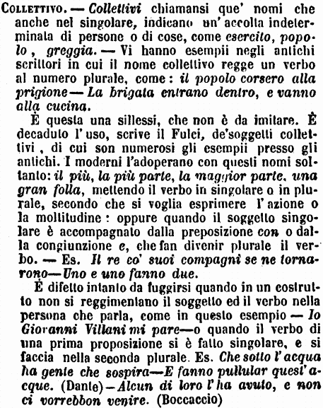 Collettivo - Collettivi chiamansi que' nomi che anche nel singolare, indicano un'accolta indeterminata di persone o di cose, come esercito, popolo, greggia. - Vi hanno esempii negli antichi scrittori in cui il nome collettivo regge un verbo al numero plurale, come: il popolo corsero alla prigione - La brigata entrano dentro, e vanno alla cucina.