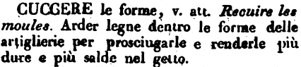 Cuocere - le forme, v. att. Recuire les moules. Arder legne dentro le forme delle artiglierie per prosciugarle e renderle più dure e più salde nel getto. [immagine]