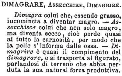 Smagrare, Dimagrire, Smagrire, Dimagrare - Dimagrare è Diventare di grasso magro, e si dice anche di altra cosa che di persona, in senso attivo, come certe sementi che dimagrano la terra. - Dimagrire è solo delle persone, ed ha più efficacia che Dimagrare. - Smagrare è Divenire molto magro, e tra esso e Smagrire c'è la stessa differenza che tra le due voci precedenti. [immagine]