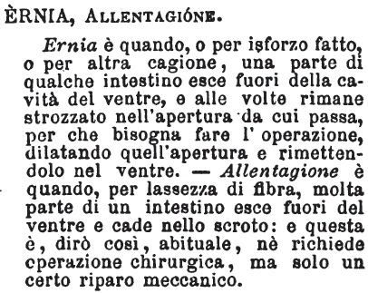 Ernia - S. f. (Chir.) Sorta di malattia, ed è l'uscire d'alcun viscere, e specialmente delle intestina, dal proprio luogo naturale, e dalla cavità che le contiene, entrando in un'altra cavità artificiale, che fa protuberanza all'esterno; ed è di più sorte. Rispetto a' varii stati in cui possono trovarsi gli organi contenuti nelle ernie, dicesi Ernia riducibile quella che scompare facilmente pel ritirarsi in dentro dei visceri; Ernia irreducibile quella, nella quale questi visceri stessi contrassero aderenze, o acquistarono certe disposizioni che li ritengono fuori di sito; finalmente Ernia strangolata quella, in cui gli organi compressi dall'apertura che lasciò il morboso passo, o da qualche altra parte del loro immediato inviluppo s'infiammano e si strangolano. Dal gr. Ἔρνος, Ramo, perchè quando l'intestino comincia a cader nello scroto, sembra che formi de' rami. (Mt.) È in Cels. – Lib. cur. malatt. (C) Da questi eccedenti sforzi nasce l'ernia del bellico, che volgarmente si dice allentatura. E altrove: Lo empiastro di questa erba vale molto a tutte le ernie, e le sana. Ar. Supp. 2. 4. Dice che vi puzzano Li piedi e le ditella…, che vi pende l'ernia.
