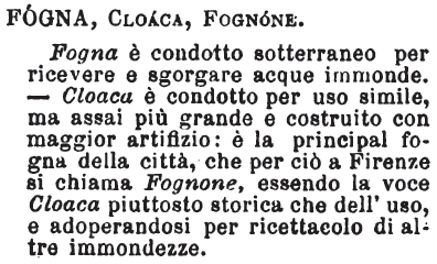 «Fogna, condotto per ricevere o sgorgare acque immonde. In altri luoghi, fogna si chiama quel che a Firenze bottino; il luogo ove si raccolgono le immondezze de' privati. Cloaca, condotto per uso simile, ma di costruzione più artificiosa; ed è voce storica». Romani.