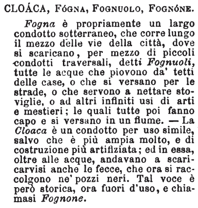 Fogna, Cloaca, Fognone - Fogna è condotto sotterraneo per ricevere e sgorgare acque immonde. - Cloaca è condotto per uso simile, ma assai più grande e costruito con maggior artifizio: è la principal fogna della città, che per ciò a Firenze si chiama Fognone, essendo la voce Cloaca piuttosto storica che dell'uso, e adoperandosi per ricettacolo di altre immondezze. [immagine]