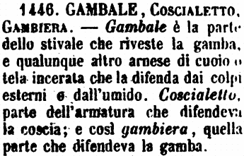 | Gambale, Coscialetto, Gambiera - Gambale è la parte dello stivale che riveste la gamba, e qualunque altro arnese di cuoio o tela incerata che la difenda dai colpi esterni e dall'umido. Coscialetto, parte dell'armatura che difendeva la coscia; e così gambiera, quella parte che difendeva la gamba. [immagine] |