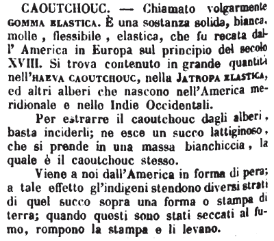 Per estrarre il caoutchouc dagli alberi, basta inciderli; ne esce un succo lattiginoso, che si prende in una massa bianchiccia, la quale è il caoutchouc stesso.