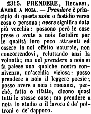 | Prendere, Recarsi, Avere a noia - Prendere è principio di questa noia o fastidio verso cosa o persona; avere significa data più vecchia: possono però le cose prese o avute a noia fastidire per le qualità loro poco attraenti ed essere in noi effetto naturale, non concorrendovi, reluttando anzi la volontà; ma nel prendere a noia si fa palese una qualche nostra connivenza, un'accidia viziosa: posso prendere a noia il leggere poesie; posso avere a noia i romanzi, perché fatto e rifatto, dicono quasi tutti le stesse cose; ma prendere a noia lo studio o il lavoro è de' poltroni e de' dappoco. [immagine] |