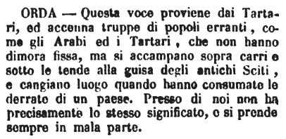 Orda - S. f. Voce tartara. Frotta numerosa, che, trascorrendo da luogo a luogo dimora sotto le tende per cambiare abitazione quando abbia consumato le provvigioni che si è procacciate. L'usa il Magal. ed altri; ed a significare cosa che non è nostra può usarsi questa voce non nostra. V. la Relazione de' Moscoviti, ecc. p. 6. (Fanf.) T. Suono imit. come il gr. ̔Ορμή, ̓Ορέγω. Algar. 6. 90. Un battaglione russo, non due pezzi d'artiglieria, metterebbe in iscompiglio parecchie orde di Tartari. E 106. Dopo battute alcune orde, o compagnie di Tartari. L'Algarotti lo scrive coll'I.