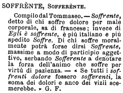 | Soffrente, Sofferente - Compilo dal Tommaseo. - Soffrente, detto di chi soffre per dolore per male corporale, sa di francese; invece di Egli è soffrente, è più italiano e più spedito Soffre. Di chi soffre moralmente potrà forse dirsi Soffrente, massime a modo di participio aggettivo, serbando Sofferente a denotare la forza dell'animo che soffre per virtù di pazienza. - «Se tutti i soffrenti dolore fossero sofferenti, la soma dei dolori e anco dei vizii scemerebbe.» G. F. [immagine] |